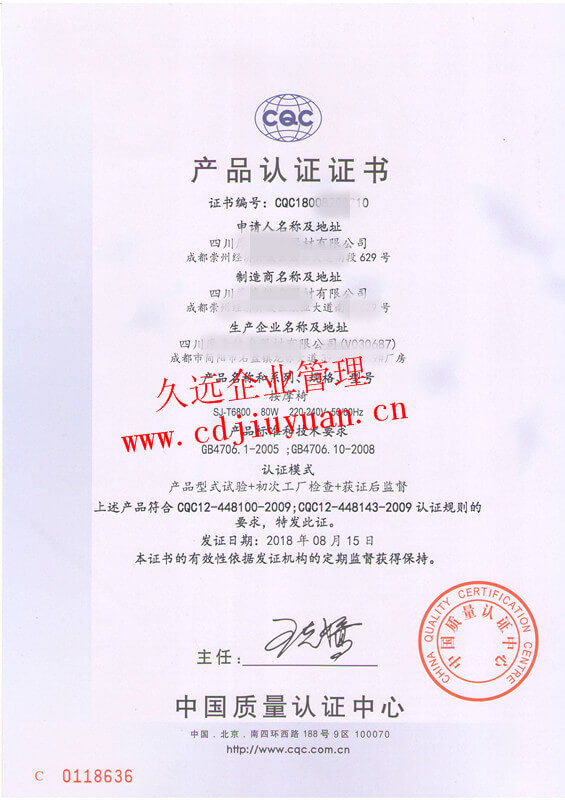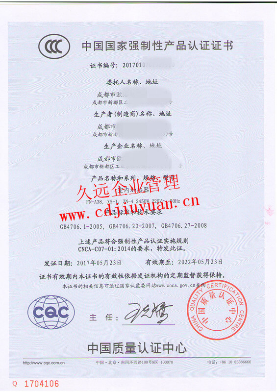 CQC標(biāo)志產(chǎn)品認(rèn)證證書(shū)